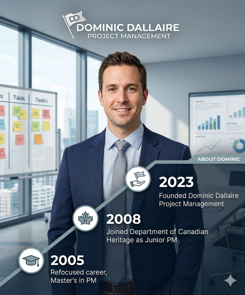 Dominic discovered his passion for project management in 2005 and promptly refocused his career, earning a Master’s degree in the field. He joined the Department of Canadian Heritage as a Junior Project Manager in 2008. After 17 years of dedicated service, culminating in his current role managing the department’s IT Project Delivery Office, his enthusiasm remains strong. In 2023, he founded Dominic Dallaire Project Management to share his extensive experience and passion with a broader audience.